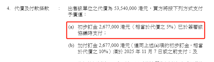 先付267.7万港元,然后是5%的中期款,90%的尾款后延数月。