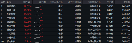 成份股方面,半导体领衔上攻,通富微电、北方华创涨停,华海清科涨超17%,盛美上海涨逾16%,拓荆科技涨超15%,中微公司涨超11%。